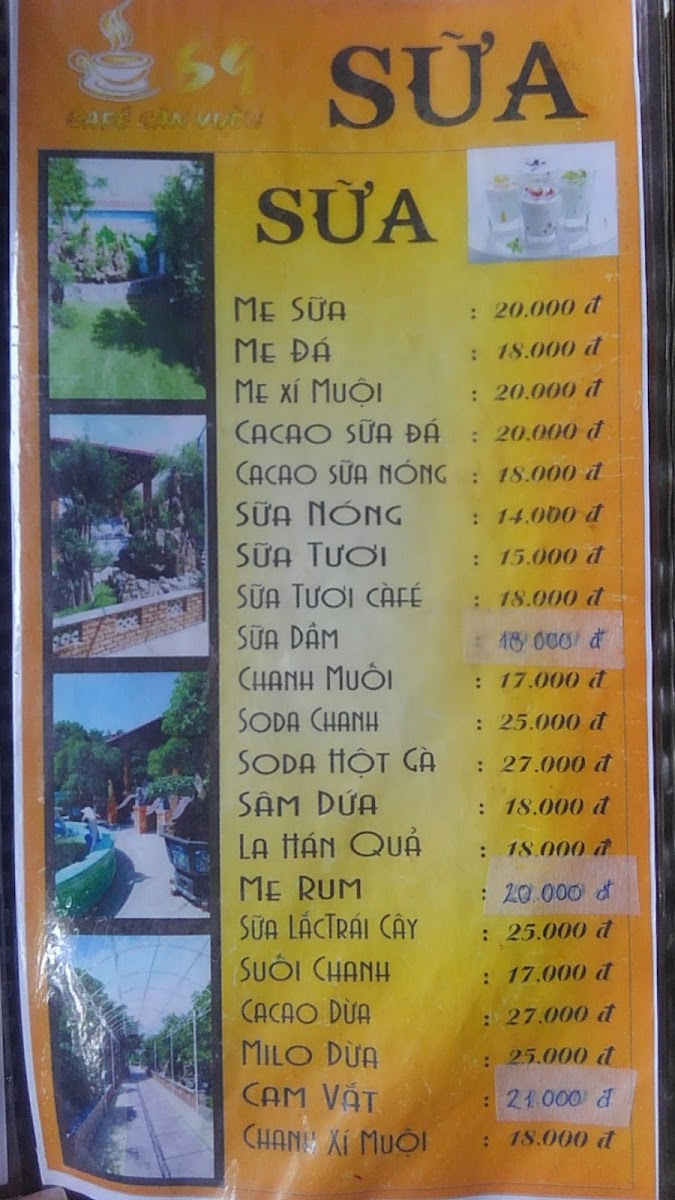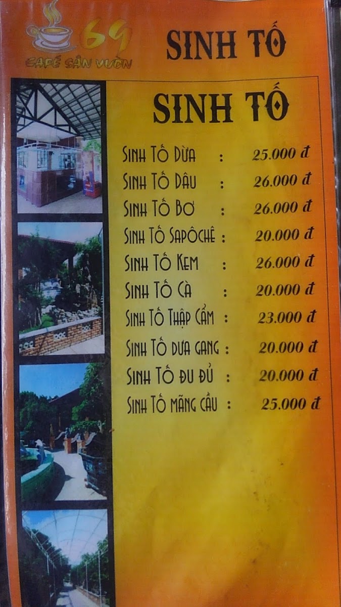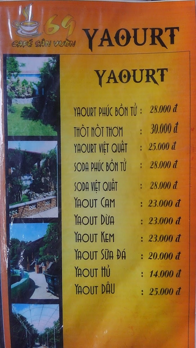 The menu at Cafe Sân Vườn 69 features a variety of coffee-based beverages along with refreshing drink options that cater to different preferences. Visitors can expect classic coffee selections, including traditional Vietnamese coffee with milk, as well as specialty drinks such as fresh coconut water and iced yogurt drinks.